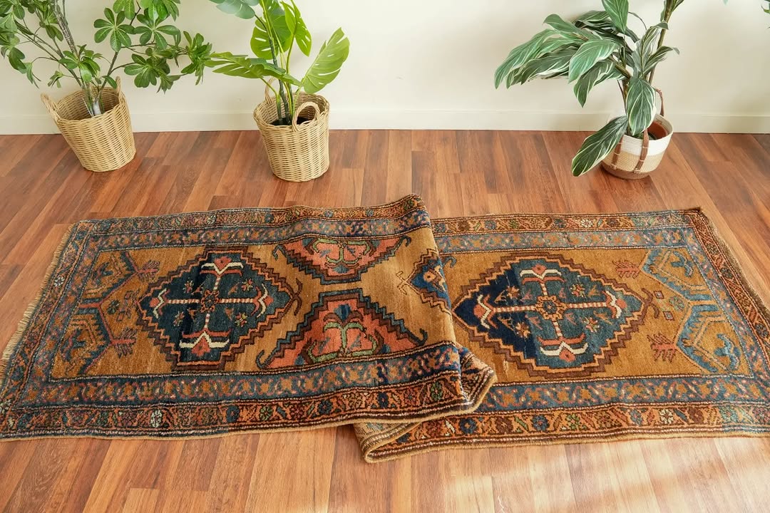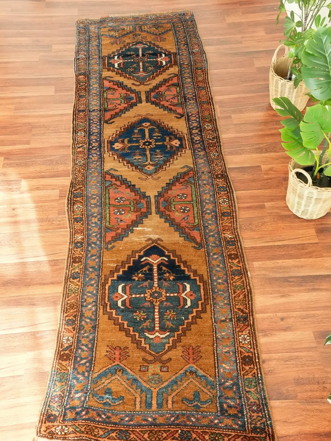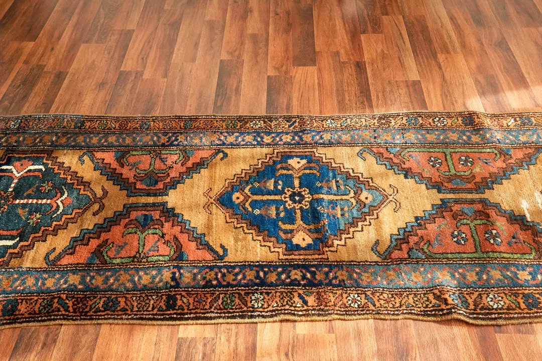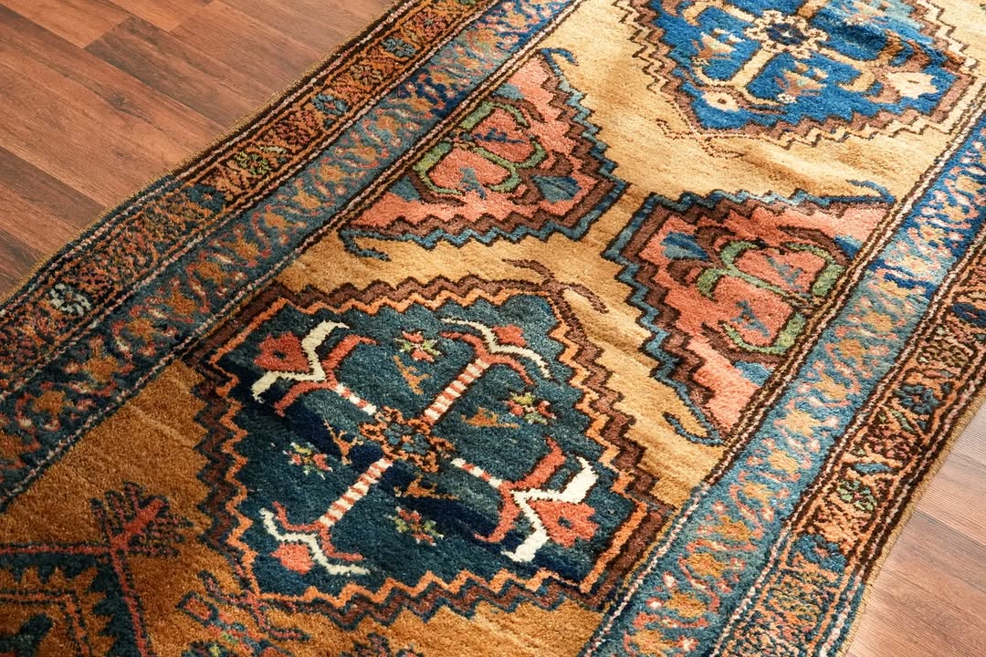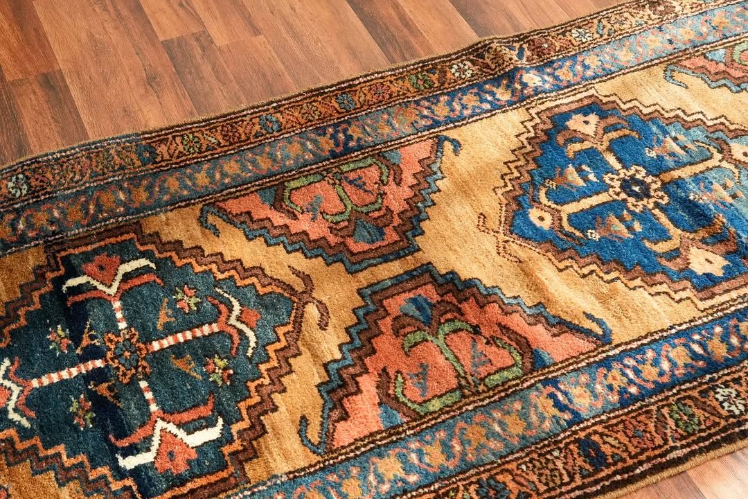 A beautiful Sarab runner with a warm camel wool field and exceptional pile height that feels wonderful underfoot. Subtle pops of blue and pink emerge from the medallions, complemented by a fantastic natural green. Look closely and you will find charming little birds hidden within the medallion designs. At just over 3 feet wide it fits hallways perfectly, and the 10-plus-foot length makes it a real statement piece. The colors are made for the home.